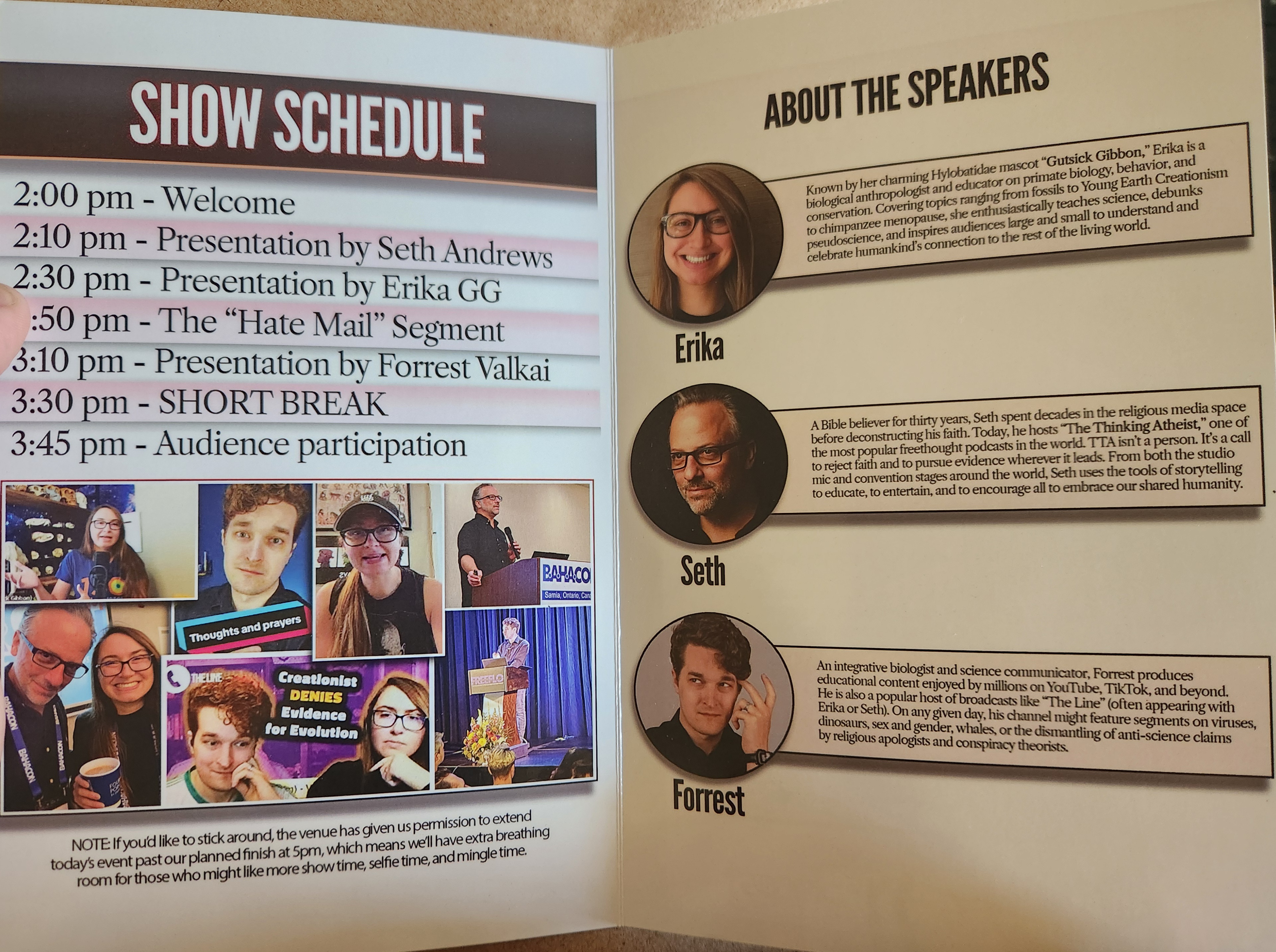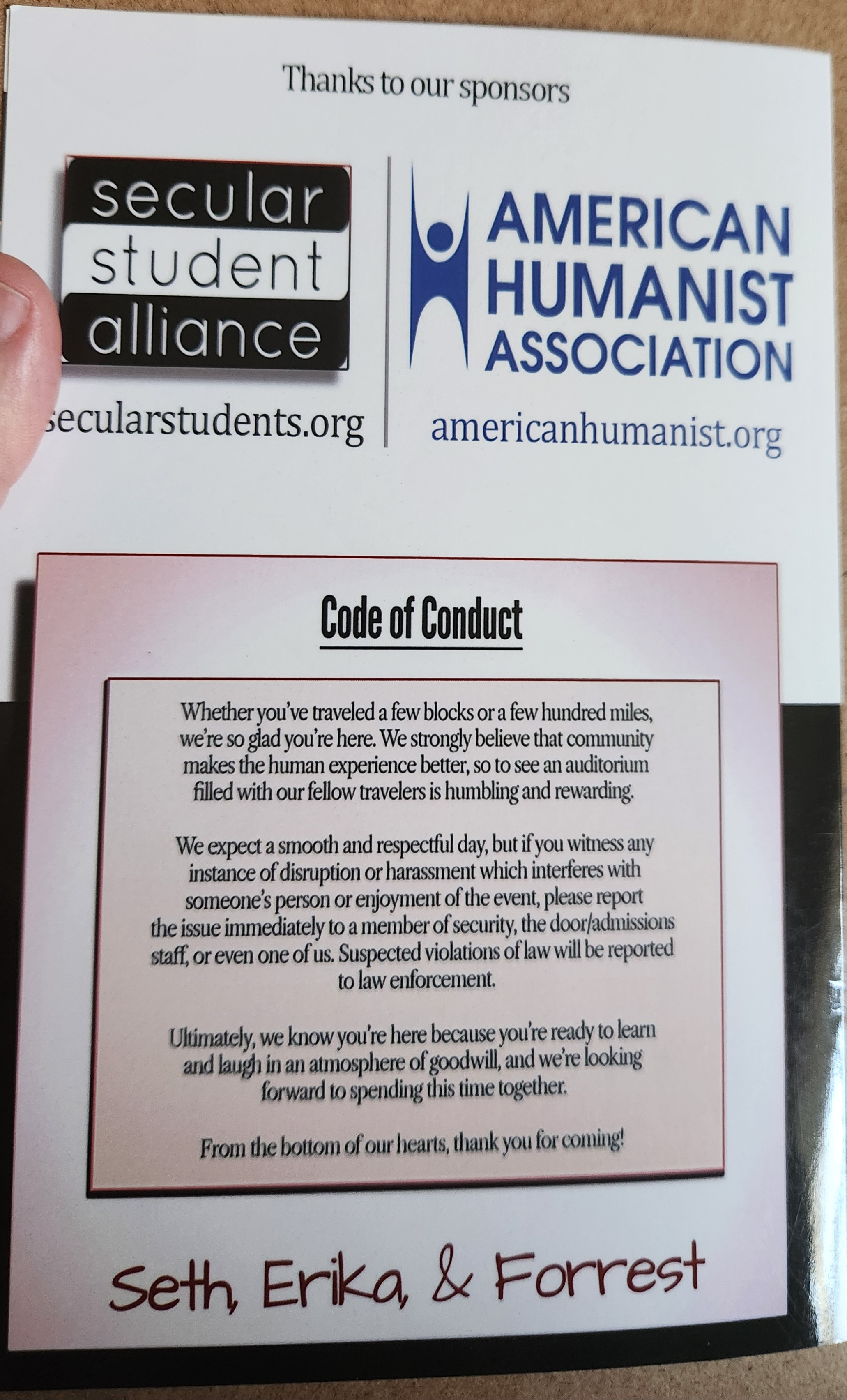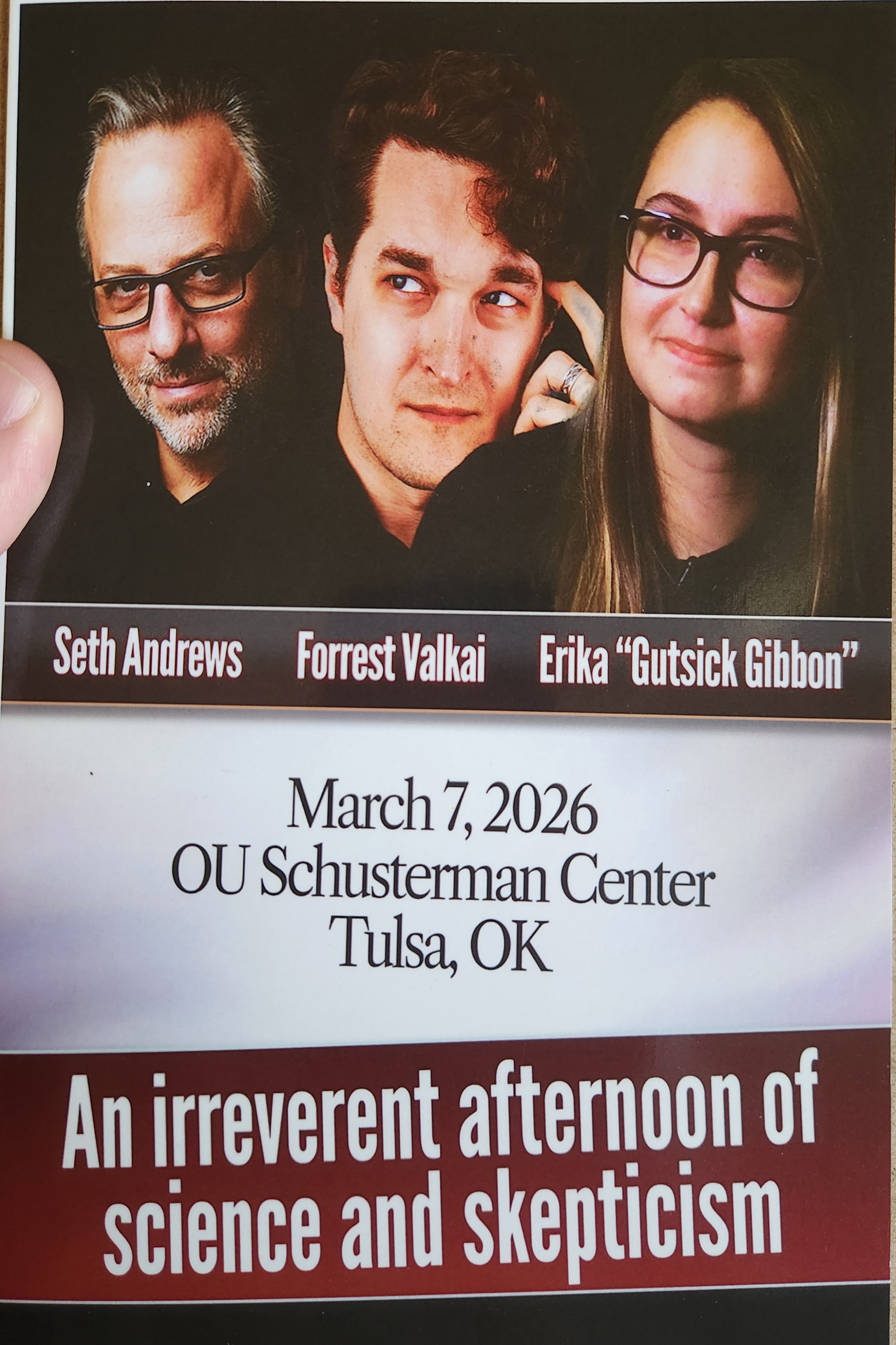 The Spring has started out Strong, there were several from our local chapter who went on a Road trip to see 3 brilliant and delightful speakers talk about science mostly. The event was in Tulsa and had Seth Andres, Forest Valkai, and Erika “Gutsick Gibbon”. This event was the brain child of Seth Andrews. It warmed my Secular heart to see so many people (approx. 300), it was a SOLD OUT show. People from all over America came. There was an after party meetup hosted by the Atheist Community of Tulsa ACT members.