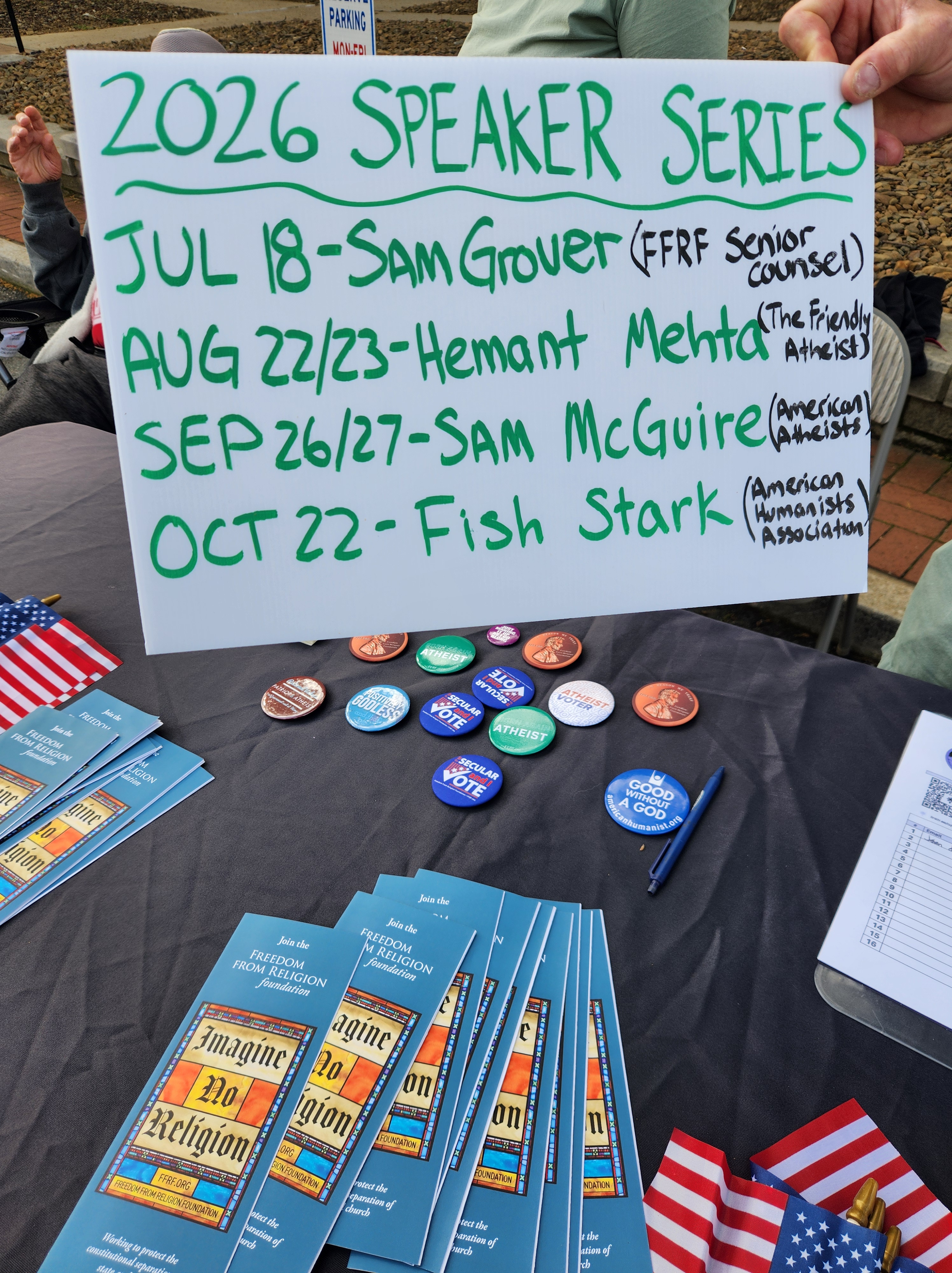 Importance of being seen and present in our community. We choose to be active in our community in many ways. We do a road side clean up, we are going to be participation in the American Empathy Project. We are active at Pride events, No Kings days, Farmers Markets, and even our Summer Speaker Series. We are trying to show that the seculars community cares as much about our community as everyone else. We are proud to be representing FFRF and the importance of Serration of Church and State.