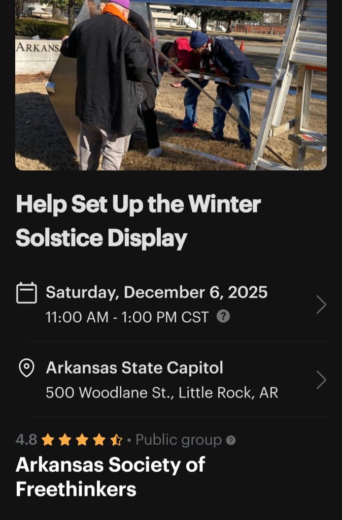 Secular Sunday Meetup – we will be holding our first General Meeting of 2026 at the Meteor Cafe (401 SE D St, Bentonville, AR 72712).